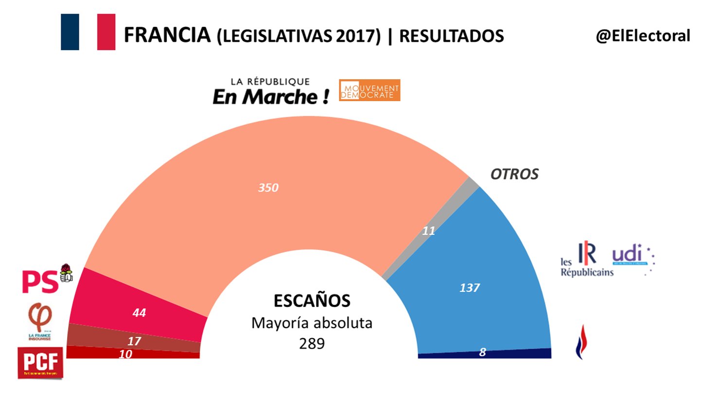 Los resultados de las elecciones legislativas en Francia representan una victoria clara para La République en Marche (LRM), y es la segunda mayoría más abultada de la historia de la V República (después de la de 2002 con Jacques Chirac arropado por el país después del terremoto Jean-Marie Le Pen). A nivel de gobernabilidad los resultados también son buenos para el partido de Emmanuel Macron, ya que si por algún motivo tuviera que restar durante su mandato a sus aliados del Movimiento Demócrata (MoDem) de François Bayrou, su grupo se mantendría por encima de los 300 diputados (la mayoría absoluta está en 289).