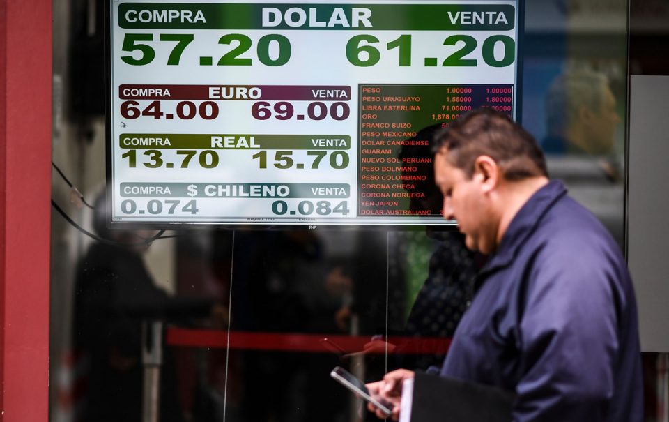 Los valores de cambio de divisas aparecen en el tablero de compra-venta de una oficina de cambio de Buenos Aires, el 30 de agosto de 2019/ RONALDO SCHEMIDT/GETTY