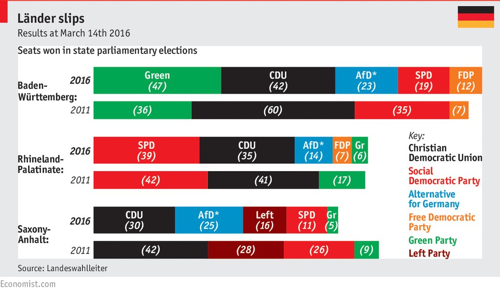 Con un discurso amargo, atizador del odio cuando no abiertamente xenófobo o racista, AfD ganado casi un 15% de los votos en los dos Länder del Oeste y un 24% en Sajonia-Anhalt, de la antigua RDA. Entra en los tres parlamentos regionales y se encuentra ya representado en ocho de los 16. Aunque no cabe pensar que tome parte en ninguno de los nuevos gobiernos, acaricia la probabilidad de llegar al Bundestag, el parlamento nacional, en las elecciones de 2017.