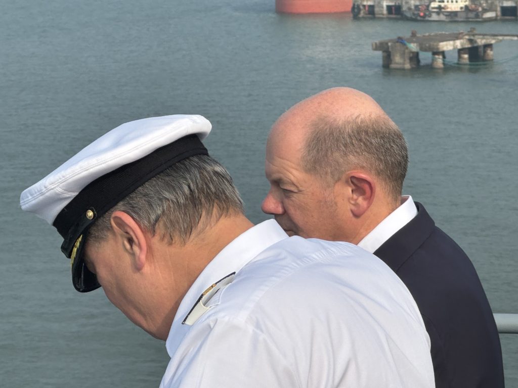 El Canciller Olaf Scholz (SPD, dcha.) visitó a los soldados del buque de aprovisionamiento de la Marina alemana 'Fráncfort del Meno' y rindió homenaje a su despliegue en el Indo-Pacífico. 27 de octubre de 2024. GETTY.