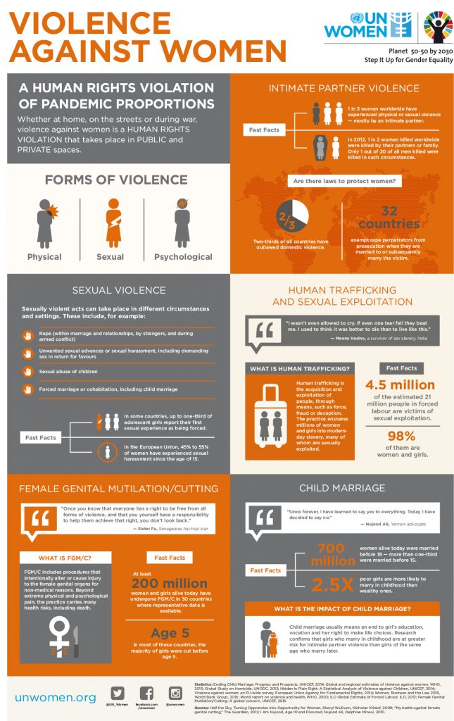 La ONU estima que 1 de cada 3 mujeres experimenta violencia física o sexual en algún momento de su vida. En la actualidad, más de 600 millones de mujeres viven en países donde la violencia doméstica no es considerada delito.