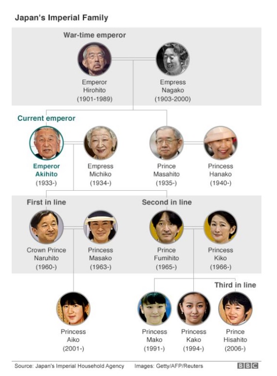 Por el momento, el estado de salud de Akihito es la principal preocupación. Cuando el hijo mayor del emperador, Naruhito, ocupe el trono, se solventará el problema al menos por unos años. No obstante, el proyecto de ley del gobierno japonés expresa que ni él ni ninguno de sus sucesores contarían con la posibilidad de abdicar. Las esperanzas están puestas en Hisahito, nieto de Akihito. De no tener este herederos varones, la línea imperial se rompería.
