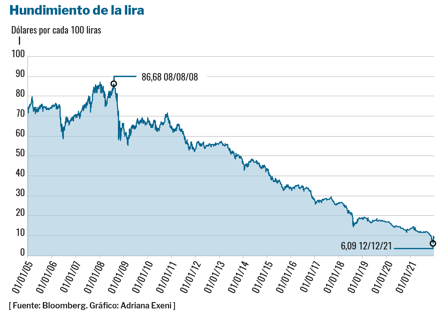 Sin embargo, todo se torció con el comienzo de la primavera árabe en 2011 y la posterior radicalización del presidente Recep Tayyip Erdogan. En los últimos meses, el país ha asistido a la última deriva: la divisa. En 2021 perdió más del 55% de su precio respecto al dólar y, aunque la promesa de proteger los ahorros del presidente permitió una subida importante de la lira, al final la caída estará próxima al 40%.