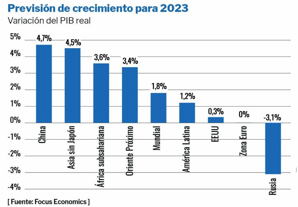 Las previsiones económicas ensombrecen el año nuevo. En 2022 el impulso de la salida de la pandemia fue suficiente para mantener un elevado dinamismo económico en todos los rincones del mundo a pesar del inicio de la crisis energética. Pero en 2023 este impulso desaparece en todos los países salvo en China, donde incluso genera más incertidumbre por la persistencia del virus. Sin este empuje adicional, los riesgos que se concentran en el horizonte inmediato aumentan las probabilidades de recesión en varias regiones del mundo.