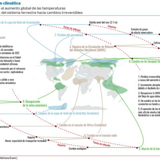 El deshielo del permafrost, el debilitamiento de la capacidad de sumidero de carbono de bosques y suelos, la creciente respiración bacteriana de los océanos, el posible colapso de la Amazonía, la degradación de los bosques boreales, etcétera, son algunos de los subsistemas que podrían verse afectados. Traspasados determinados puntos de inflexión (tipping points), se activarán dinámicas de cambio en dichos subsistemas, lo que reforzará el aumento de la temperatura de la atmósfera. Esto, a su vez, incidirá sobre dichos procesos generando bucles de retroalimentación y desencadenando un efecto cascada. En esas circunstancias, el proceso de desestabilización del sistema climático podría escapar a nuestro control.