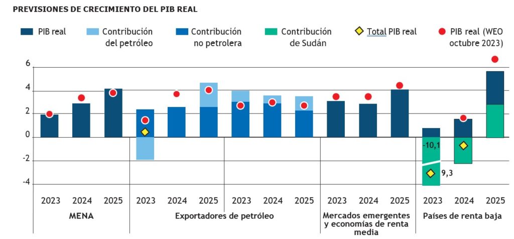 En vista de estos acontecimientos, instituciones financieras internacionales como el Fondo Monetario Internacional (FMI) han revisado a la baja sus previsiones de crecimiento para la región MENA, citando la agudización de los desafíos actuales como consecuencia de la guerra. El FMI ha ajustado su previsión de crecimiento para la región al 2,9%, lo que supone un bajada de 0,5 puntos porcentuales respecto al 3,4% de octubre de 2023, todo ello muy desigualmente repartido. Esta revisión a la baja subraya el impacto económico que plantea grandes desafíos para las economías altamente expuestas de la región.