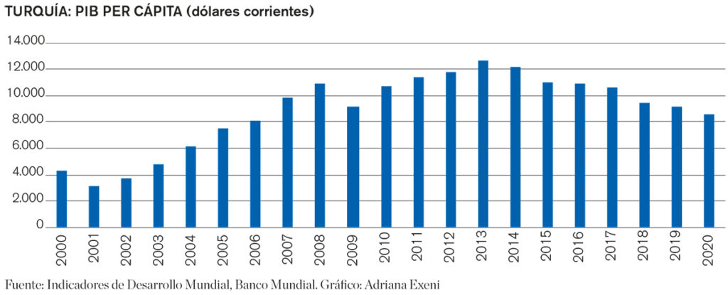 Atrás quedaron los días en los que la economía turca ocupaba los titulares como la estrella de las economías emergentes. Desde su valor máximo de 12.600 dólares en 2013, el PIB per cápita retrocedió a 8.500 dólares en 2020, continuando una tendencia a la baja de siete años. Turquía registró un impresionante crecimiento del 11% en 2021, llevando el PIB per cápita hasta los 9.400 dólares. Esto indica una buena perspectiva en comparación con el comportamiento de algunos países desarrollados en 2021, pero solo a primera vista. Si se profundiza, el crecimiento de dos dígitos se debió principalmente al “efecto base”, ya que las restricciones por la pandemia del Covid-19 supusieron un freno al crecimiento económico en 2020. Además, el crecimiento se realizó a expensas de una inflación récord, lo que revela no solo una mala gestión económica, sino también una situación difícil de mantener. De cara al futuro, la elevada inflación y los riesgos acumulados probablemente empañarán el crecimiento de dos dígitos. Las previsiones para 2022 muestran que caerá por debajo del 5% previsto en el Programa a Medio Plazo de Turquía para 2022.
