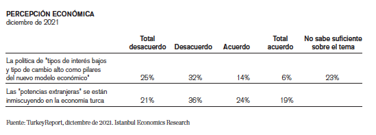 De nuevo en diciembre, preguntamos si las «potencias extranjeras» se estaban inmiscuyendo en la economía de Turquía. Aunque el ministro Nebati rechazó cualquier posible intervención, el presidente Erdogan afirmaba –en el momento de la encuesta– que Turquía se encontraba efectivamente en una guerra de independencia económica. Según los resultados, mientras que el 57% de los encuestados no creía que la economía estuviera «bajo ataque» de potencias extranjeras, el 43% apoyaba esta afirmación.