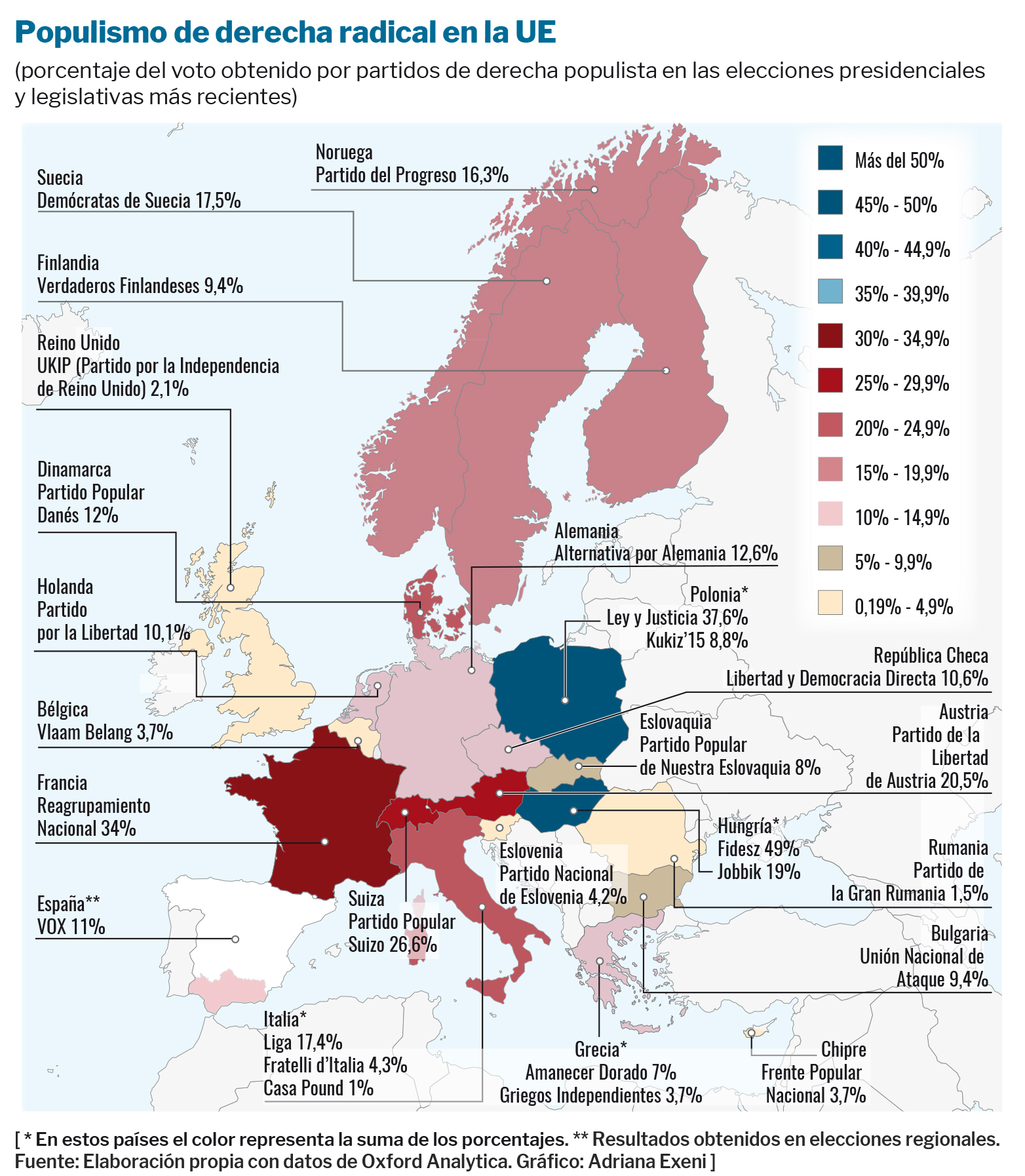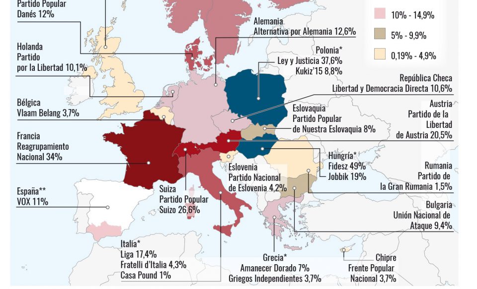El pánico moral ante el avance de la extrema derecha en toda Europa (incluido ahora también España) conduce a menudo a sobrestimar su potencia.1 En concreto, en lo que se refiere a su capacidad de actuar unida, alcanzar acuerdos y llevar adelante una estrategia coral. Esta idea está alimentada por cinco factores: la presencia en el continente del antiguo director de campaña de Donald Trump, Steve Bannon, cada vez más frecuente, y la creación de la plataforma The Movement; la entrada en el gobierno de partidos como el FPÖ austríaco o la Liga italiana de Matteo Salvini; la creciente influencia del grupo de Visegrado, que aglutina a Polonia, Hungría, República Checa y Eslovaquia; la aparición de partidos políticos de extrema derecha con expectativas electorales crecientes en países como Alemania (Alternativa por Alemania, AfD) o España (Vox), donde formaciones de este estilo no habían existido más que de manera grupuscular en los últimos 40 años; y el aguante y la pujanza electorales de formaciones históricas de este campo político como el Rassemblement National en Francia (RN, antiguo Frente Nacional), el PVV en Holanda, el Vlaams Belang en Bélgica, el Partido Popular Danés, o también los nórdicos Demócratas de Suecia y Verdaderos Finlandeses.