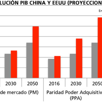 Según las proyecciones de PwC, el PIB de China a precios de mercado será en 2030 un 12% mayor que el de EEUU, y en 2050 un 46% mayor. En PPA, el PIB chino superará al estadounidense en un 62% en 2030 y en un 70% en 2050. En este último año el PIB de India habría adelantado al de EEUU en PPA (44,1 billones de dólares India, frente a 34,1 billones EEUU), aunque no a precios de mercado (34,1 billones de dólares EEUU, frente a 28 billones de India). En 2012 PwC preveía que el PIB chino sería en 2050 un 35% mayor que el estadounidense a precios de mercado, y en PPA un 57% mayor. Si esta tendencia se mantuviera, la diferencia…