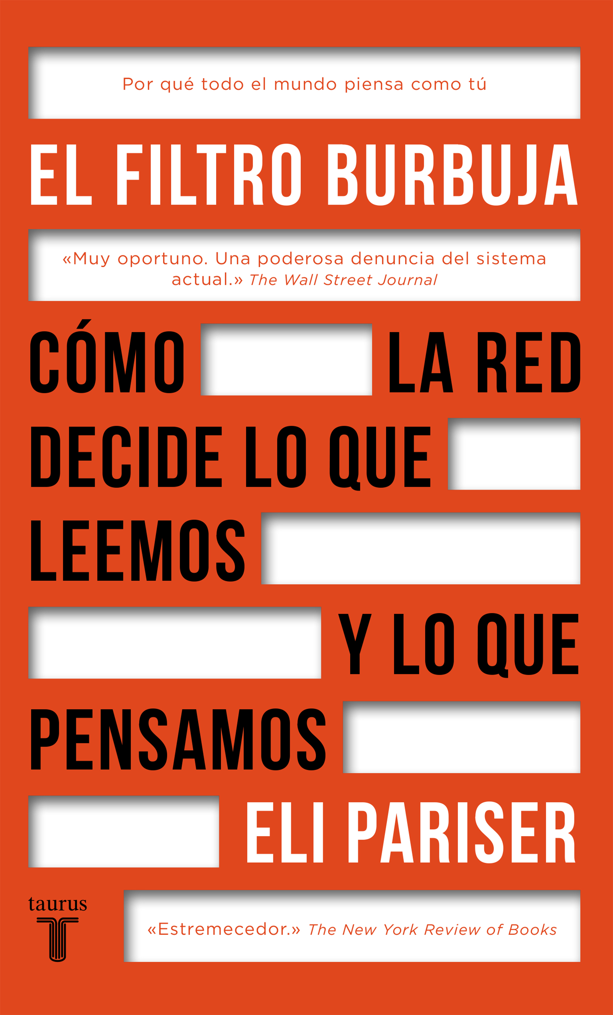Esta es la idea fuerza impulsada por Eli Pariser en El filtro burbuja. Cómo la red decide lo que leemos y lo que pensamos, que acaba de publicar en España la editorial Taurus. En el libro, el autor realiza un exhaustivo recorrido, desde un enfoque multidisciplinar, sobre cómo la personalización de la experiencia digital nos sume en un “filtro burbuja que transforma de manera invisible el mundo que experimentamos mediante el control de lo que vemos y lo que no vemos. Interfiere en la interacción entre nuestros procesos mentales y nuestro entorno exterior”.