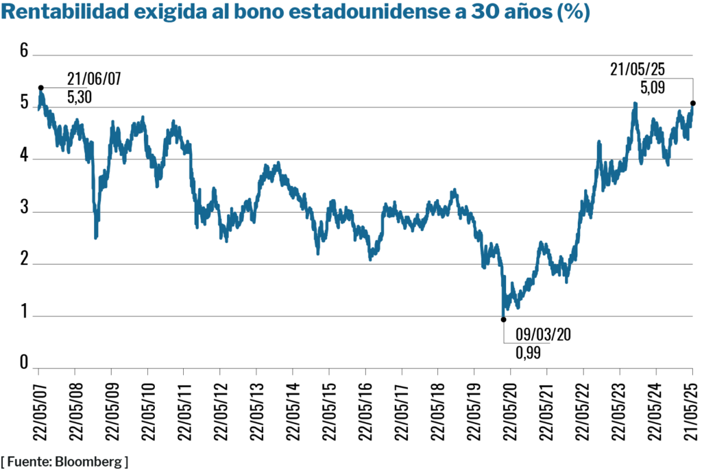 Aunque Trump ha vuelto a la carga recomendando un arancel del 50% a los productos europeos, su estilo agresivo ya se percibe únicamente como una herramienta de presión, dando a entender que ha rectificado en su estrategia comercial. Aunque lejos de volver a las tarifas previas al mes de febrero, se ha propuesto emular otro momento histórico, el de la primera ministra británica Liz Truss. Su bajada de impuestos en el año 2022 provocó una reacción contraria de los mercados que precipitó su dimisión. No duró ni siquiera dos meses.
