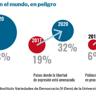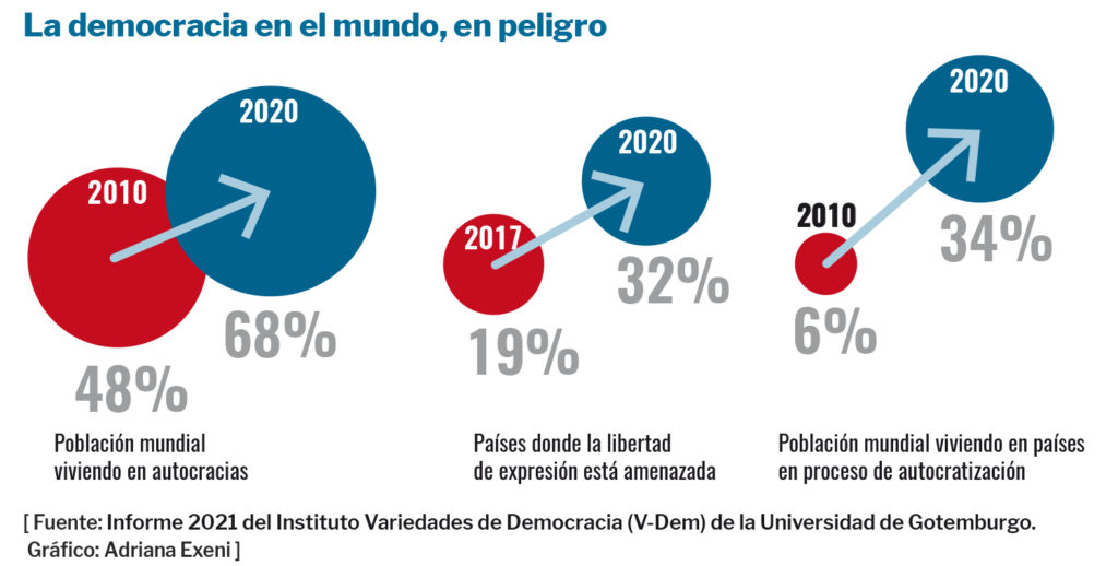La autocratización, el deterioro de las cualidades democráticas, se intensifica. La “tercera ola de democratización”, que empezó con la Revolución de los Claveles de 1974 en Portugal, ha sido sustituida por una “tercera ola de autocratización”, que se ha acelerado en los últimos años. Según el Informe 2021 del Instituto Variedades de Democracia (V-Dem) de la Universidad de Gotemburgo, más de una tercera parte de la población mundial –2.600 millones de personas– vive en los 25 países donde el despotismo gana terreno, frente al 4% residente en los 16 países en vías de democratización.