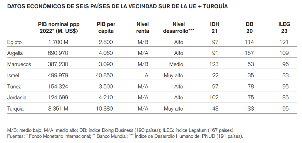 Del grupo de países 6+1, el único que se acerca al PIB per cápita promedio de la UE es Israel y tiene una convergencia real con la UE. Turquía tiene el segundo PIB per cápita, pero no llega al 50% del país de la UE con menor PIB per cápita, Bulgaria. Este, a su vez, es casi cinco veces superior al de Jordania y Argelia. En cuanto al nivel de desarrollo humano, salvo en Marruecos, es alto en la mayoría de ellos. Asimismo, se observa que el clima de negocios es menos favorable en Argelia y Egipto pero es bueno en Israel y Turquía y aceptable en el resto. En el índice de prosperidad Legatum realizado por The Fund For Peace a partir de 12 indicadores, todos, salvo Israel, obtienen puntuaciones por debajo de la mitad de la clasificación. La mayoría de los siete países, incluido Israel, obtienen su peor calificación en capital social, donde se encuentran en la parte baja de la lista. Esto puede interpretarse como que las sociedades no confían en las instituciones ni hay participación de la sociedad civil. Por tanto, las sociedades siguen sin encontrar una vía de participación en unos países en los que el Estado es omnipresente.