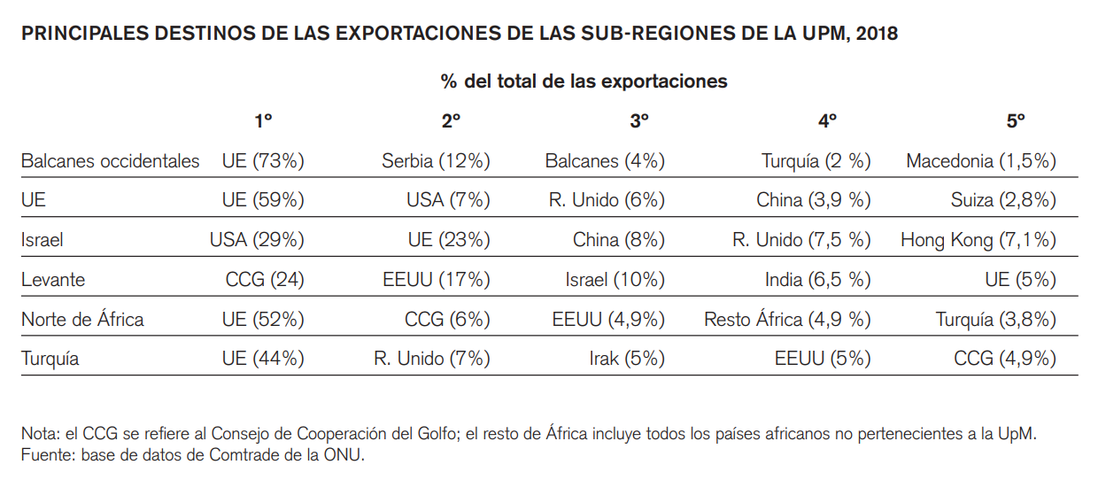 La vecindad sur de la UE incluye en la actualidad a Argelia, Egipto, Israel, Jordania, Líbano, Libia, Marruecos, Siria, Túnez y Palestina. Estos países han tenido una evolución muy dispar tanto en sus economías como en sus relaciones económicas con la UE, que tiene en vigor acuerdos para fomentar el libre comercio con todos los países, salvo Libia que no fue en su día país tercero mediterráneo ni firmó la Declaración de Barcelona. Los casos de más éxito son, sin duda, Marruecos y Túnez, con los que tiene en vigor una zona de libre comercio industrial desde 2012 y 2018, respectivamente. Con ambos países la UE está negociando acuerdos más completos y profundos. Con Egipto firmó un acuerdo para la liberalización recíproca del comercio de productos agrícolas, pesqueros y alimentos procesados en 2009 y con Argelia un memorando para establecer un partenariado estratégico en el sector energético en 2013.