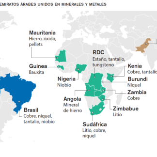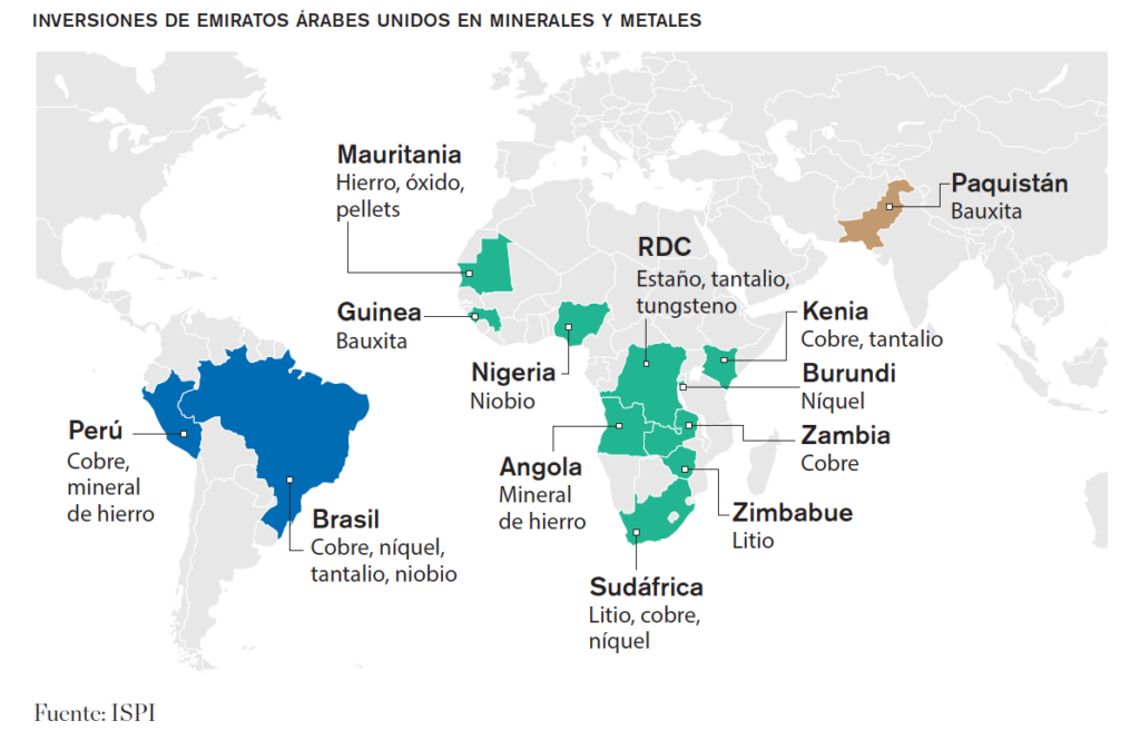 EAU mira al exterior con una estrategia para invertir a través de su propio fondo soberano y otros fondos de nueva creación en países ricos en minerales. EAU ha invertido activamente en activos minerales críticos en el extranjero, como cobre en Perú, litio en Zimbabue, tántalo en Kenia y bauxita en Pakistán.