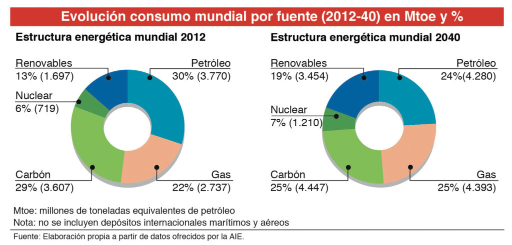 Las previsiones de la AIE, en su escenario de “Nuevas Políticas”, estiman que la demanda de energía primaria mundial crecerá aproximadamente un 42% entre 2012 y 2040. Más del 99% de este crecimiento tiene su origen en países no miembros de la Organización para la Cooperación y el Desarrollo Económicos (OCDE), lo que significa que su participación en el consumo total de energía ascenderá al 70% en 2040.