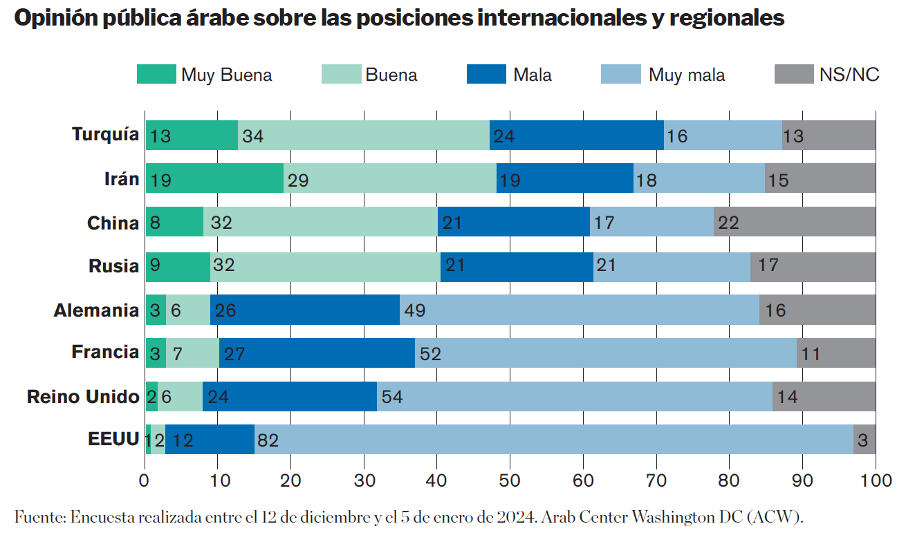 Así lo ha reflejado una encuesta publicada el 8 de febrero de este año por el Arab Center Washington DC. La encuesta se realizó dentro de los primeros tres meses de la guerra, entre el 12 de diciembre de 2023 y el 5 de enero de 2024, en 16 naciones árabes, y abarcaba a más de 8.000 encuestados, representando más del 95% de la población árabe. El aspecto más relevante de las conclusiones es, sin duda, que Irán ha emergido como el actor regional más influyente en su respuesta a la guerra de Israel en Gaza, con el 48% de los encuestados expresando apoyo a la postura de Teherán, por delante de otros actores regionales e internacionales como Turquía, China, Rusia, Alemania y Francia. La percepción relativamente positiva respecto a Irán también se da frente a la opinión negativa hacia las respuestas de los propios Estados árabes ante la guerra. Los resultados indican un cambio en la percepción, con Irán visto como una amenaza menor para la seguridad y estabilidad regional después del conflicto en Gaza en comparación con 2018. Mientras que el 7% de los árabes considera a Irán como la principal amenaza (frente al 13% en 2018), el 51% identifica las políticas de Estados Unidos como las más amenazantes, seguido por Israel con el 26%.