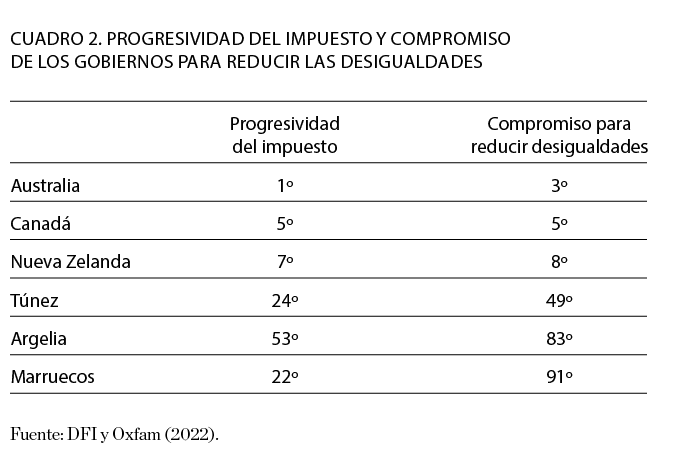 La eficacia de las políticas fiscales de los países del Magreb en la reducción de las desigualdades también puede evaluarse en función del grado de progresividad de la escala impositiva. El cuadro 2 muestra la clasificación de algunos países según el índice de compromiso para reducir la desigualdad económica calculado a través de medidas redistributivas que los gobiernos pueden adoptar. Este índice, que incluía 161 países en 2022, fue elaborado por Walker et al. (2022) para el Development Finance International Group y Oxfam. El informe también clasifica a los países según el grado de progresividad de sus escalas impositivas y se observa una correlación positiva entre esta progresividad y el compromiso de los Estados de reducir las desigualdades económicas. La progresividad fiscal tiene un margen de mejora significativo en los países del Magreb que, si lo aprovechan, sin duda mejorarán su clasificación en cuanto a compromiso para reducir las desigualdades.