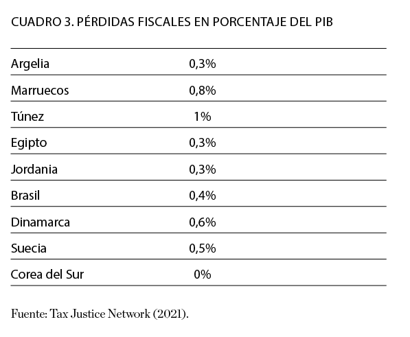 Según el informe de la ONG Tax Justice Network (2021), las pérdidas fiscales por fraude en el impuesto de sociedades se estiman en 413,75 millones de dólares en Argelia, 806,93 millones de dólares en Marruecos y 374,25 millones de dólares en Túnez. En cuanto a lo que se deja de ingresar fiscalmente por la riqueza en paraísos fiscales, la suma asciende a 53,3 millones en Argelia, 69,6 millones en Marruecos y 38,7 millones en Túnez. En este último caso, si incluimos las pérdidas fiscales relacionadas con el régimen impositivo a tanto alzado, se estima que el fraude fiscal, por sí solo, sería de 25.000 millones de dinares, es decir, el 24% del PIB (Oxfam, 2020). Por otro lado, la economía marroquí pierde anualmente una suma estimada de 24.500 millones de dirhams, es decir, el 2,34% del PIB, debido a las prácticas de evasión fiscal de las multinacionales (Oxfam, 2019). Esta sangría beneficia a las personas más ricas e influyentes a costa de las más vulnerables, que sufren el continuo deterioro de los servicios básicos que presta el Estado y, a su vez, no reciben ninguna ventaja económica directa.