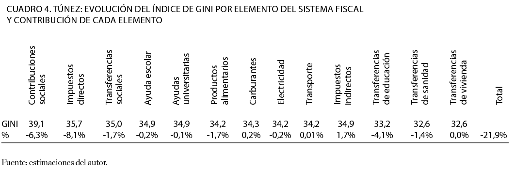 El cuadro 4 proporciona más detalles sobre la contribución estimada de cada elemento a la reducción de la desigualdad de ingresos medida por el índice de Gini.