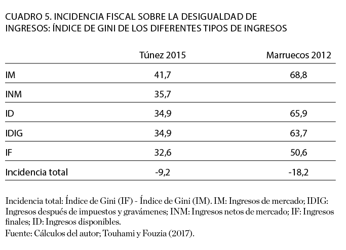 Touhami y Fouzia (2017) han desarrollado una metodología similar para analizar el impacto fiscal en la desigualdad de ingresos en Marruecos para el año 2012. Sus resultados ponen de relieve una diferencia importante en comparación con Túnez en cuanto a la incidencia fiscal, que se sitúa principalmente en el nivel del gasto público (en educación y sanidad) (cuadro 5). La contribución de estos gastos en Marruecos (el pasaje del Gini relativo a los ingresos después de impuestos y el relativo a los ingresos finales) en la disminución de la desigualdad de ingresos es significativamente mayor que la observada en Túnez. Si no se tiene en cuenta el impacto del gasto público, la comparación indica que existe una política fiscal más igualitaria en Túnez (disminución del Gini de 41,7 para los ingresos de mercado a 34,9 para los ingresos después de impuestos) que en Marruecos (el Gini bajó de 68,8 a 63,7).