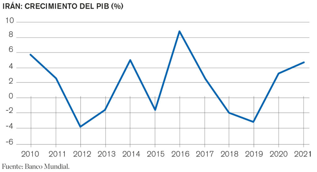 Irán, con casi 145.000 muertos, es el país de Oriente Medio más afectado por esta crisis (OMS). El impacto económico de la Covid se ha producido a través de dos canales. En primer lugar, el colapso de la actividad en el mundo a principios de 2020 provocó una caída en la demanda mundial de petróleo, lo que llevó a un desplome del precio del petróleo. Esta bajada de los precios tuvo un impacto especialmente grave en las exportaciones de petróleo de Irán, que ya desde 2018 registraban una caída muy severa en volumen: pasaron de 61.000 millones de dólares en 2018 a 21.000 millones en 2020 (Banco Central de Irán). El segundo canal fue, como en la mayoría de los países, la caída de la actividad en los sectores que tuvieron que parar total o parcialmente debido a la pandemia. El sector servicios (y sobre todo el comercio minorista) que emplea a casi el 51% de los trabajadores iraníes, tuvo una contribución negativa al crecimiento del PIB en el primer trimestre de 2020. Además, las clases sociales más desfavorecidas fueron las más afectadas por estas medidas, porque son también aquellas cuyos miembros trabajan principalmente en estos sectores y con menos frecuencia como empleados del sector público (“Distributional Impact of Covid 19 in the Middle East and North Africa region”, Mena Development Report, Johannes G. Hoogeveen y Gladys López-Acevedo, Ed., BM, 2021.). Cabe señalar que, a partir de finales de mayo de 2020, las autoridades, sin duda por las consecuencias económicas del confinamiento, procedieron a una reapertura relativamente rápida de la mayoría de las actividades, con cierres temporales hasta 2021 por nuevas olas de contagios. El gobierno ha puesto en marcha una serie de medidas de apoyo a la población y las empresas (estimadas por el FMI en casi el 13% del PIB) para paliar el coste económico y social de la pandemia (FMI, Policy Responses to Covid 19). Sin embargo, estas medidas se vieron limitadas por el hecho de que, al mismo tiempo, las sanciones estadounidenses privaban a Irán de parte de sus ingresos (EEUU se negó a finales de 2020 a que Irán se beneficiara de un préstamo de 5.000 millones de dólares del FMI para luchar contra la pandemia).