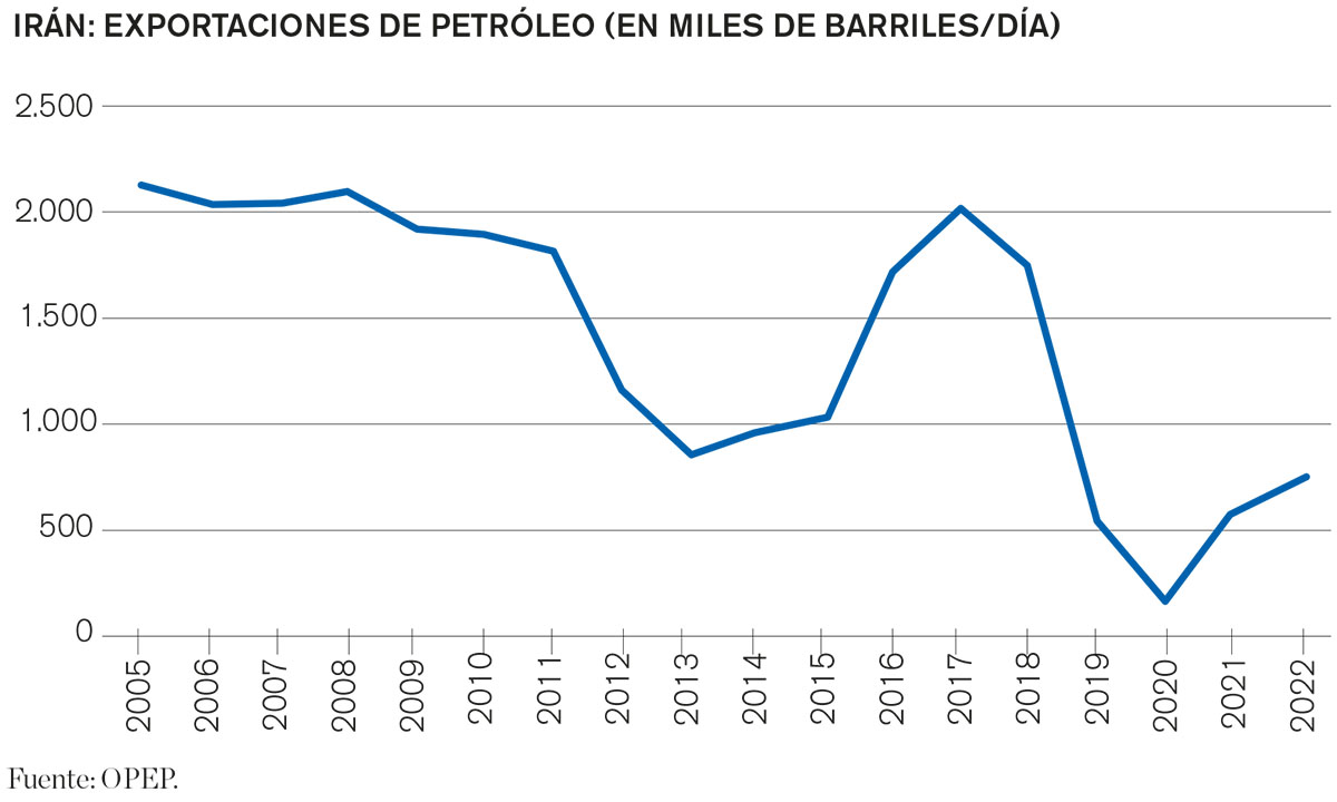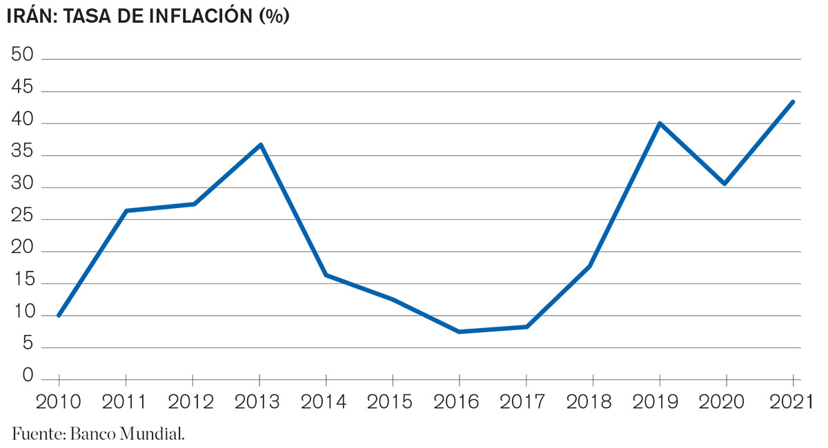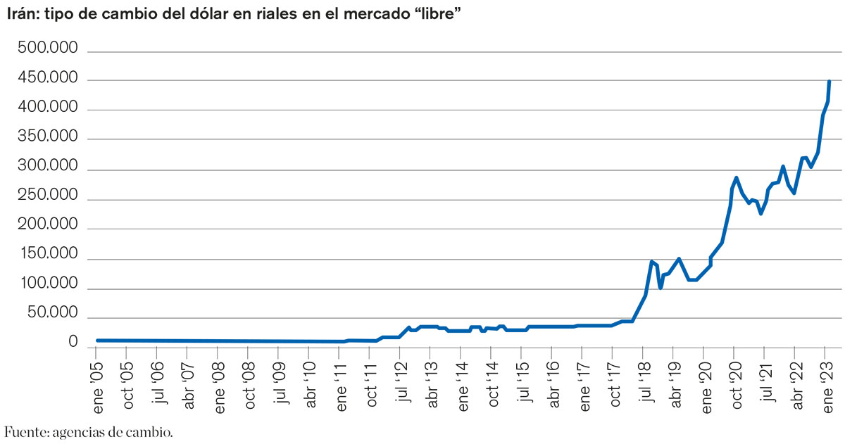 No se trata de decir que todas las dificultades de la economía iraní se deben a las sanciones. Así, sabemos que el carácter rentista del sistema económico instaurado desde la revolución ha dado lugar a numerosas disfunciones (op.cit.). Sin embargo, está bastante claro que el deterioro del entorno macroeconómico desde 2018 se explica esencialmente por la reimposición de las sanciones estadounidenses, y en particular de un embargo del petróleo, con la salida de Estados Unidos del acuerdo nuclear en mayo de 2018. En 2010, antes de que Irán sufriera una década de sanciones debido a su programa nuclear, las exportaciones de petróleo representaban el 70% del total de sus exportaciones y el 60% de los ingresos del Estado (FMI). En estas condiciones, el embargo del petróleo impuesto por Estados Unidos a partir de 2018 provocó el desplome de las exportaciones petroleras y un retroceso de la actividad en Irán. Ante una disminución de los ingresos presupuestarios inducida por las exportaciones de petróleo, el gobierno tuvo que reducir sus gastos presupuestarios y, en particular, sus gastos de inversión. Al mismo tiempo, el hundimiento de la moneda iraní frente al dólar en el mercado libre de divisas –y, por tanto, el aumento inducido en los costes de importación– ha llevado a muchas empresas iraníes importadoras de bienes intermedios a limitar, si no detener, su producción. Además, el embargo estadounidense del petróleo también ha provocado una aceleración de la inflación. El gobierno iraní, privado de parte de sus ingresos presupuestarios, ha incrementado su endeudamiento con el sistema bancario (el Banco Central y los bancos comerciales), lo que ha acelerado la creación de moneda y, por tanto, la subida de precios. Al mismo tiempo, la moneda iraní, debido a la disminución de los ingresos de divisas, se ha derrumbado en el mercado libre de cambio: el dólar que se cotizaba a 46.000 riales a principios de 2018 alcanzó en febrero de 2023 el nivel récord de cerca de 480.000 riales. Esta depreciación de la moneda ha contribuido al aumento de los precios de importación y las tensiones sobre los precios en los últimos años.