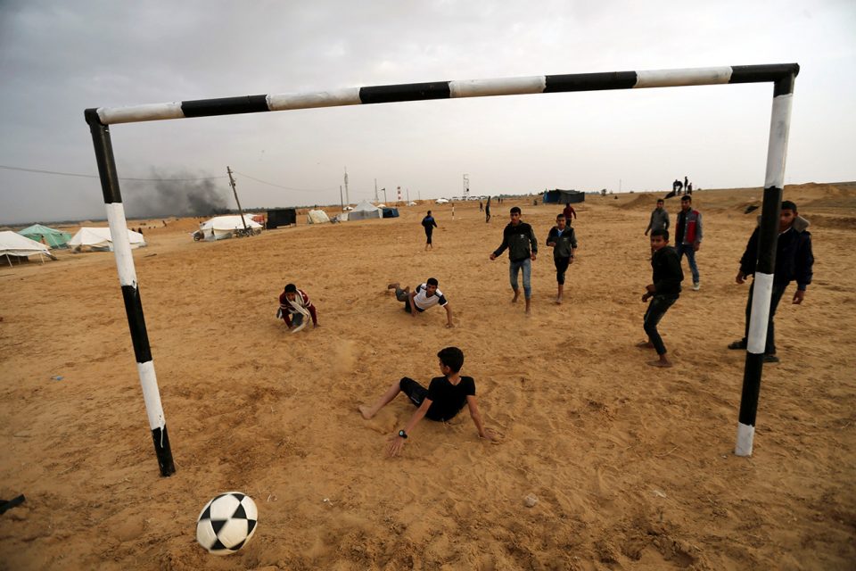 Una vez por semana, los viernes por la mañana, el caos en la Franja de Gaza deja paso a la tranquilidad y a un silencio ocasional. La llamada a la oración resuena intermitente desde 100 alminares, pero las calles que conducen al estadio Jan Younis están vacías, una circunstancia efímera en uno de los lugares más pobres y densamente poblados de la tierra. Un grupo de niños juega al fútbol en una parcela de terreno al lado del campo, mientras que en su interior, sobre la hierba reseca y amarillenta, Mahmud Wadi entrena con su equipo, el Ittihad Khan Yunis. El joven de 22 años es delantero y capitán. Les saca una cabeza a sus compañeros, que hacen sus ejercicios bajo un sol radiante. De hecho, su apodo es La Torre.