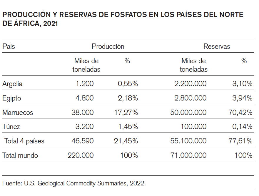 En efecto, los recursos de fosfato de Marruecos, Egipto, Argelia y Túnez son bastante elevados. Los tres primeros países poseen las tres primeras reservas africanas de este mineral y se encuentran entre los 15 primeros del mundo en 2021 en cuanto a producción, según Mineral Commodity Summaries (2022). Además, Marruecos posee más de dos tercios de las reservas mundiales de fosfato. Libia, Mauritania y Sudán no tienen reservas significativas de fosfatos.