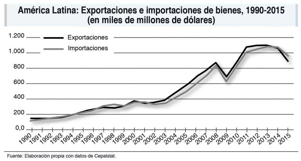 El valor de las exportaciones latinoamericanas ha presentado una significativa tendencia creciente entre 1990 y 2015, aunque con dos contracciones importantes: una en 2009, tras la crisis financiera internacional de 2008, y otra más suave a partir de 2012, de la que la región aún no se ha recuperado. Si se descuenta la caída de 2009, la región ha asistido a una destacable y rápida expansión comercial entre 2003 y 2011.