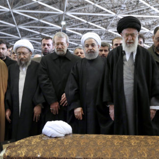 El líder supremo iraní, Alí Jamenei (segundo por la derecha), el presidente, Hasan Rohaní (tercero), y el presidente del Parlamento iraní, Ali Larijani (cuarto), en el funeral por el expresidente Akbar Hashemi Rafsanyani (Teherán, 10 de enero de 2017). ANADOLU/GETTY
