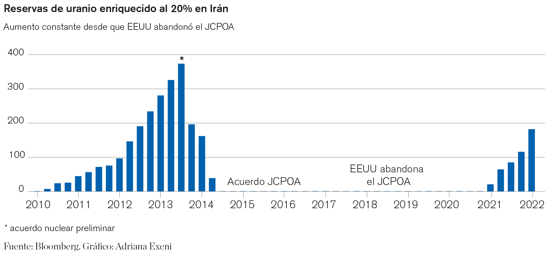 Para entender cómo se ha llegado hasta aquí hay que remitirse a 2018 cuando el entonces presidente Trump decidió retirar a Estados Unidos del acuerdo nuclear, al que catalogó de “desastre”, e imponer sanciones económicas que incluían la prohibición de Irán de vender su petróleo. Hasta la invasión de Rusia en Ucrania el pasado 24 de febrero, las sanciones a Teherán fueron consideradas las más duras a las que jamás había estado sometida una nación. Después de esperar un año a que los países firmantes de la Unión Europea cumplieran con su promesa de ayudar a aliviar los efectos de las sanciones económicas –especialmente vender su petróleo–, Irán comenzó poco a poco a retroceder en sus compromisos nucleares. Por ejemplo, ha aumentado el número de centrifugadoras avanzadas y actualmente enriquece uranio al 60%. Una cifra inmensamente mayor que la estipulada en el JCPOA que limita el enriquecimiento al 3,67%.