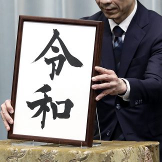 Yoshihide Suga, secretario de Gabinete, desvela el cartel con el nombre de la era Reiwa, el 1 de abril de 2019/GETTY
