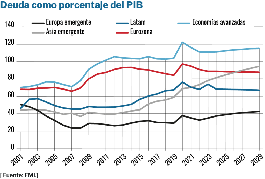 El mejor ejemplo está en Estados Unidos. Según las últimas proyecciones del FMI, su déficit público se mantendrá de forma constante por encima del 6% del PIB al menos hasta 2029. Y su deuda pública escalará por encima del 130% del PIB, con un incremento de casi dos puntos al año. Pero no es el único caso.