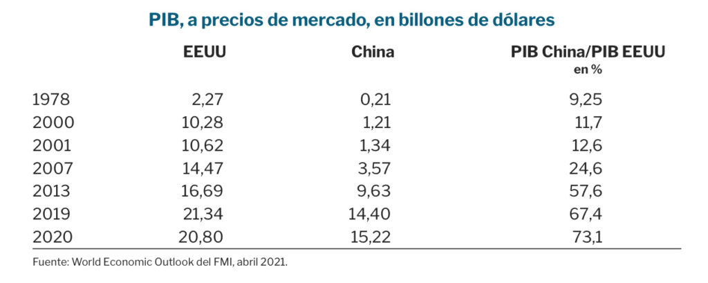 Ocho años atrás, en el número de julio/agosto de 2013 de Política Exterior, apareció la que fue mi segunda Carta de China, titulada “Increíble pero cierto: la velocidad del cambio”. El análisis detallado de la evolución del PIB de los principales países desde que Deng Xiaoping lanzó la reforma económica, en 1978, mostraba la sorprendente transformación de las balanzas económicas: el PIB de China, a precios de mercado, que no alcanzaba la cuarta parte del de Japón en 2000, lo había superado en 2010. El PIB de China era ligeramente mayor al de India en 1978 y lo cuadruplicaba en 2012 (hoy lo sextuplica). Y si en 1990 el PIB de la URSS, justo antes de su disolución, era tres veces mayor que el de China, en 2012 el de Rusia solo era una cuarta parte del de China (hoy es una décima parte).