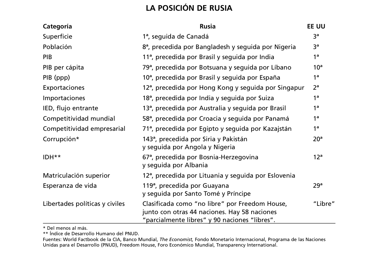 En última instancia, la fuerza política del sistema autoritario creado por Putin es consecuencia de la repentina aunque posiblemente transitoria riqueza del país. Dicha riqueza favorece el consentimiento popular pasivo y un apoyo positivo centrado en el presidente. Sin embargo, la dependencia del sistema de la afluencia de capital derivada de la extracción y exportación de recursos naturales es también su principal debilidad. La concentración de riqueza en la cúspide de la escala social, cada vez más evidente, es corrosiva y, con el tiempo, desmoralizadora.