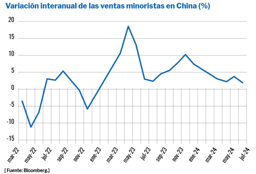 Los datos fueron peores de lo que esperaban los analistas, que preveían un crecimiento próximo al 5,3%. El consumo doméstico no tira y así el país queda expuesto a los vaivenes del comercio en la era del proteccionismo. Las ventas minoristas están creciendo apenas un 2% interanual, el peor dato también desde 2022. Hace solo un año, tras la reapertura del Covid, las ventas minoristas crecían a tasas de doble dígito, pero el dinamismo se ha evaporado mucho antes de lo esperado.