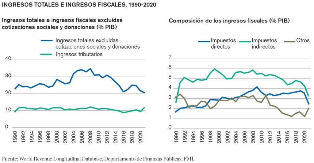 Entre 1990 y 2020, la disminución de los ingresos fiscales es muy significativa en los Estados frágiles, de alrededor del 50% (desde más del 10% del PIB en 1990 hasta el 5% en 2020). Esta disminución se explica en gran medida por el efecto directo sobre el PIB de la producción de petróleo y el impacto de los conflictos en la recaudación de ingresos fiscales (Siria, Yemen, Libia e Irak).