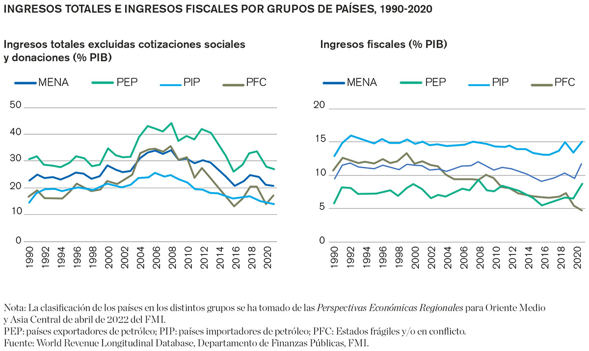 En la región de Oriente Medio y norte de África (MENA), los sistemas fiscales nacionales son relativamente recientes. Se forjaron en parte durante el período de colonización del siglo XX, es decir, se vieron influidos de manera significativa por los sistemas fiscales inglés y francés posteriores a la Segunda Guerra mundial. Su evolución desde la década de los setenta también refleja las asimetrías económicas y sociales de los países, entre ellas la forma de gobierno, el modelo de desarrollo económico, la riqueza en hidrocarburos y muchos otros factores que no son fáciles de analizar cuantitativamente. Como consecuencia de esta evolución diferente, la presión fiscal total en la región MENA oscila hoy entre menos del 5% y más del 20% del PIB.