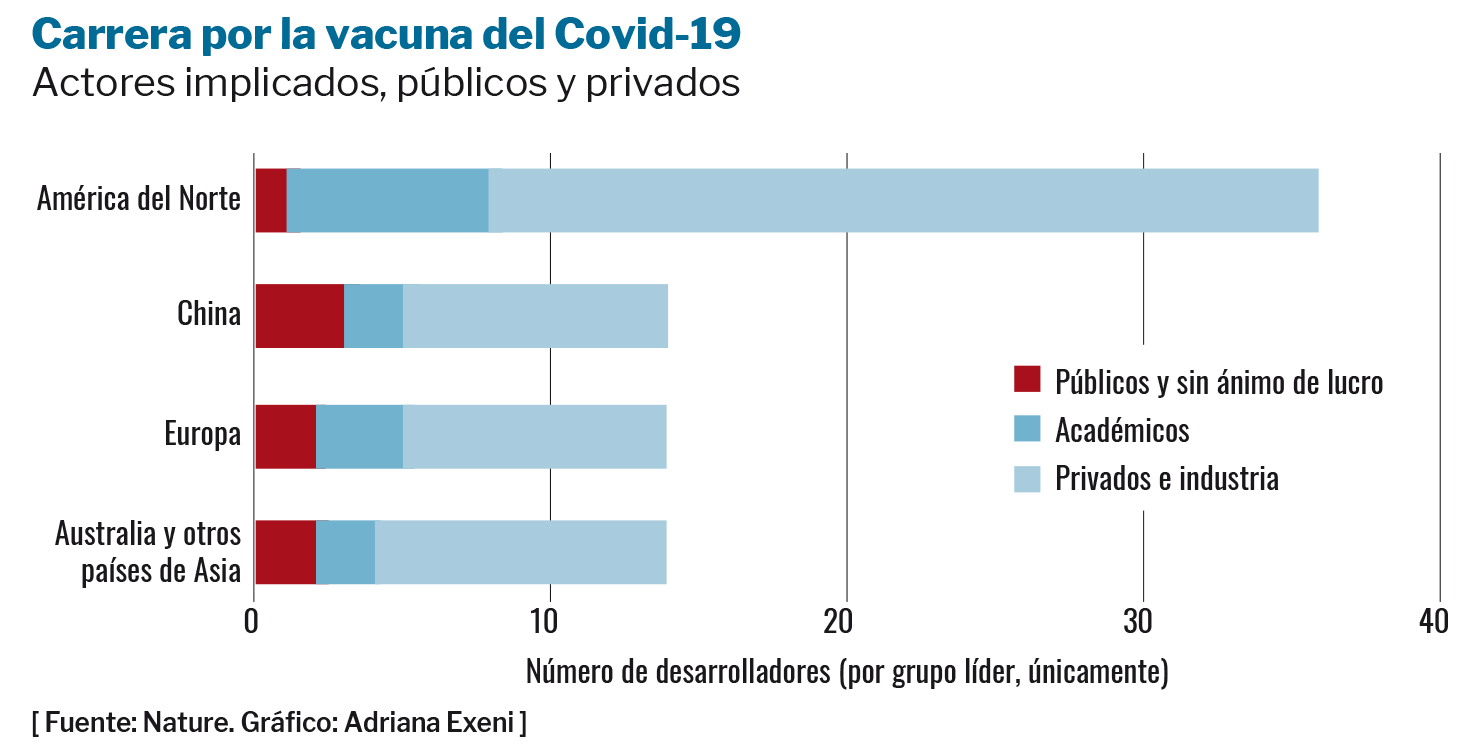 La industria occidental mantendrá el control de, al menos, algunas de las vacunas, aunque la dimensión económica de este dominio estará en manos de gobiernos y fundaciones. Se han invertido más de 7.000 millones de dólares de dinero público o procedente de la filantropía –en gran parte de EEUU, Alemania y la UE, Reino Unido y Canadá– en I+D relacionada con el Covid-19. Dos tercios de esta cantidad se ha destinado a vacunas, fármacos, pruebas diagnósticas y demás tecnología. Además, los gobiernos han financiado miles de millones para obtener los productos finales, disminuyendo el riesgo y subsidiando cada paso del proceso, desde la I+D hasta la producción y la compra.
