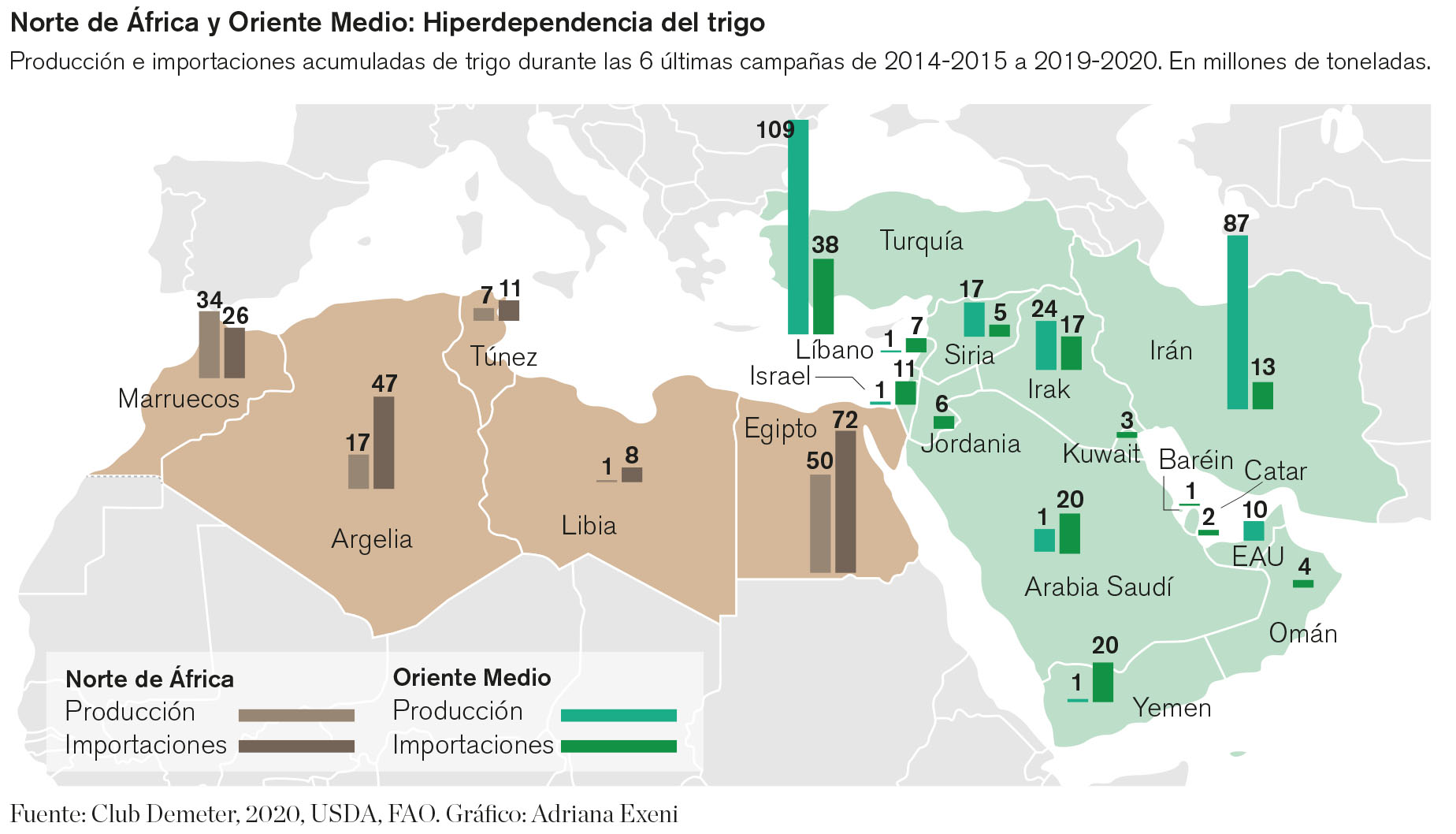 La escasez de agua y tierra, el crecimiento demográfico y la aceleración de los cambios climáticos se superponen en esta región y explican su dependencia creciente de los cereales importados. Hoy, una de cada dos calorías consumidas en la región procede del exterior y, a juzgar por los fenómenos meteorológicos extremos, esta dependencia no hará sino acentuarse. La dependencia de los países árabes también tiene que ver con factores relativos al precio, las características del trigo y la evolución de la dieta. A raíz de las tradiciones culinarias y de los escasos ingresos de una parte de los consumidores, el trigo, con el pan, es el alimento base de las sociedades mediterráneas. La región consume las mayores cantidades de pan del mundo. Egipto va en cabeza, con un consumo por habitante de 150 a 180 kg anuales, es decir, más del doble de la media mundial. Por muchas que sean las variedades de pan coexistentes en el mundo árabe, se trata de países que comparten la presencia del pan en cada comida y la dimensión simbólica que se le atribuye. En árabe coloquial, principalmente en Egipto y en Oriente Medio, la palabra aish designa tanto el pan como la vida.