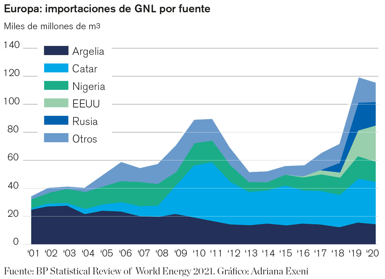 Los europeos se dirigieron primero a Catar, el mayor productor de gas natural licuado (GNL), aparte de Estados Unidos, tras haber acordado un aumento del suministro con los propios estadounidenses. El atractivo del GNL consiste en gran medida en su flexibilidad, ya que se puede importar incluso sin gasoductos, utilizando sencillamente buques cisterna que lo transportan hasta las terminales de importación, donde se procesa dejándolo listo para su uso. En un principio Catar respondió que su producción estaba comprometida en contratos a largo plazo con clientes asiáticos y que tenía poca capacidad sobrante para venderla en el mercado al contado. De hecho, Catar dudaba si ponerse de parte de Rusia, un interlocutor clave en el Foro de Países Exportadores de Gas (FPEG). Pero los europeos y los estadounidenses siguieron tratando de persuadir al emirato y a uno de sus clientes asiáticos para que desviaran parte del GNL contratado. A fin de apaciguar a Doha, la Unión Europea (UE) llegó a archivar la investigación de 2018 en la que acusaba a Qatar Petroleum de poner trabas a la integridad del mercado único de la UE. Los europeos empezaron entonces a negociar acuerdos de exportación a más largo plazo –en concreto, para después de 2025–, dado que Catar ya tenía previsto invertir para duplicar su capacidad de producción. En marzo, el ministro de Asuntos Exteriores italiano, Luigi Di Maio, y el de Energía alemán, Robert Habeck, viajaron al Golfo para asegurar el acuerdo. Ambos países apoyaron también la construcción de nuevas terminales de GNL.