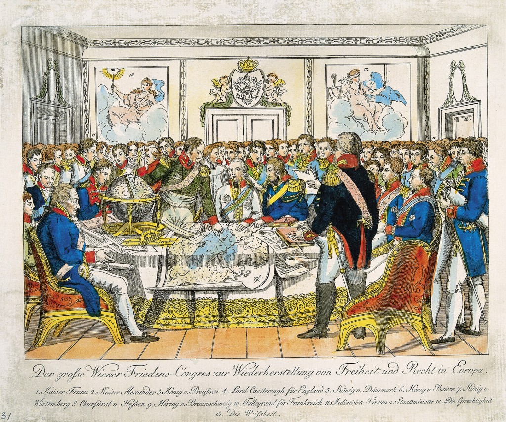 Una vez finalizadas las guerras napoleónicas, tuvo lugar el Congreso de Viena, entre septiembre de 1814 y junio de 1815. El emperador Francisco I de Austria había convocado, a instancias de su canciller, Klemens von Metternich, a monarcas y plenipotenciarios europeos. En este foro Austria, Francia, Inglaterra, Rusia y Prusia diseñaron un mapa de Europa que estableció al mismo tiempo el nuevo orden internacional que, con ligeros cambios, pervivió en Europa durante un siglo.