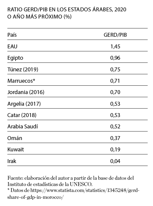 En la mayoría de los países árabes, el gasto bruto en investigación y desarrollo (GERD por sus siglas en inglés) se ha situado históricamente por debajo del 1% del PIB, a pesar de que desde hace décadas se reclama una subida. El último de estos llamamientos se produjo en la Cumbre de CTI de 2017 de la Organización de Cooperación Islámica (OCI), un grupo de 57 países de mayoría musulmana, que adoptó su Agenda CTI 2026. Esta Agenda pedía duplicar el gasto anual para 2025 en infraestructuras científicas e investigación y desarrollo en aquellos países que gastan menos del 0,3% del PIB y elevar la cifra al 2,0% en los que tienen un nivel relativamente avanzado.