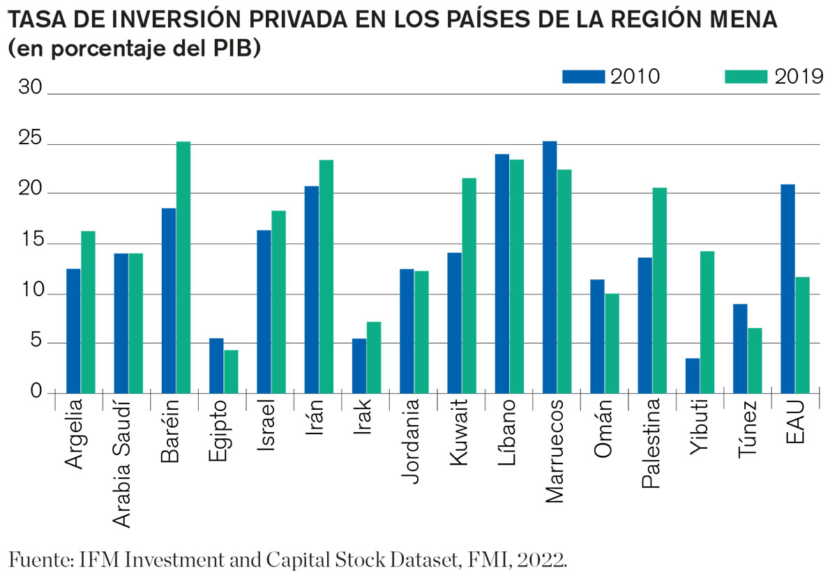 En general, los incentivos fiscales para la inversión en los países de la región MENA son generosos. Por lo tanto, cabría esperar que estas medidas suscitasen más interés entre los inversores privados, tanto nacionales como extranjeros, especialmente porque la mayoría de los países afectados tienen posiciones geográficas estratégicas y/o unas riquezas naturales significativas. Pero, por desgracia, no es así. Si, por ejemplo, observamos la tasa de inversión privada (gráfico 2), vemos que solo seis de los 20 países han logrado superar el límite simbólico del 20%. Además, contrariamente a las expectativas, algunos países fiscalmente muy generosos como EAU, Arabia Saudí y Omán han registrado unas tasas de inversión relativamente bajas. Y lo que es peor, los países que han convertido la reactivación de la inversión a través de incentivos fiscales en una prioridad nacional, como Egipto, Túnez e Irak, no han conseguido atraer a inversores privados. Con una tasa de inversión privada que no supera el 8%, ocupan la parte inferior de la clasificación de los 20 países de la región.