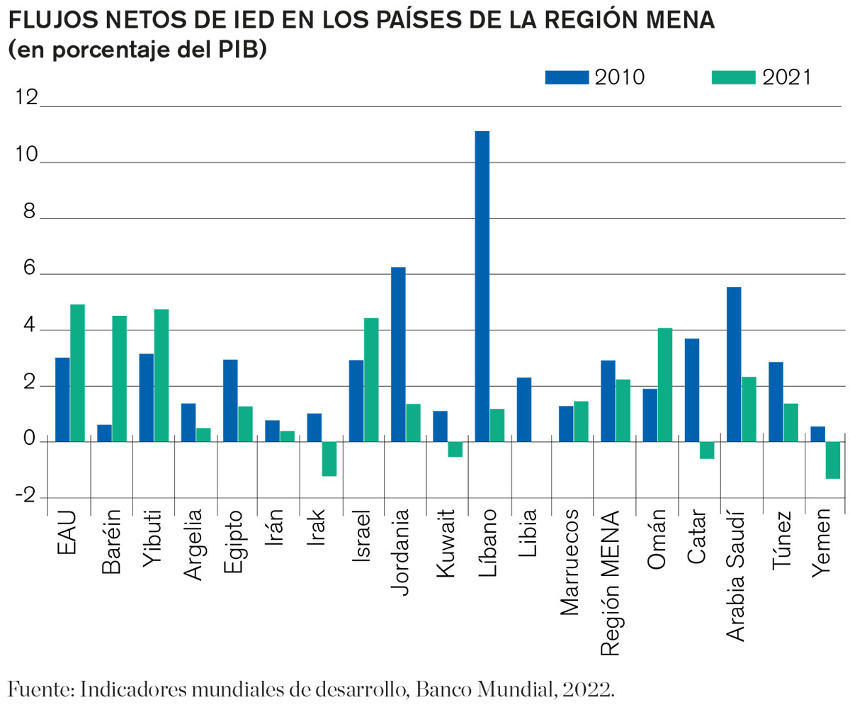 Si nos centramos ahora en los flujos de inversión extranjera directa (IED), los resultados registrados son bastante desiguales, con diferencias significativas de un país a otro y de un período a otro. En 2021, solo seis países de la región MENA lograron superar el promedio mundial del 2,3% del PIB (gráfico 3). Se trata, en orden, de EAU, Yibuti, Baréin, Israel, Omán y Arabia Saudí. Además, mientras que Egipto y Argelia fueron capaces de mejorar el sistema fiscal que regula la inversión extranjera en 2016 y 2017, respectivamente, fueron menos atractivos en 2021 en comparación con 2010. Por el contrario, aunque el sistema fiscal en Líbano no experimentó ningún cambio importante entre 2010 y 2021, el atractivo del país para la IED ha disminuido significativamente, del 11,13% al 1,18%.