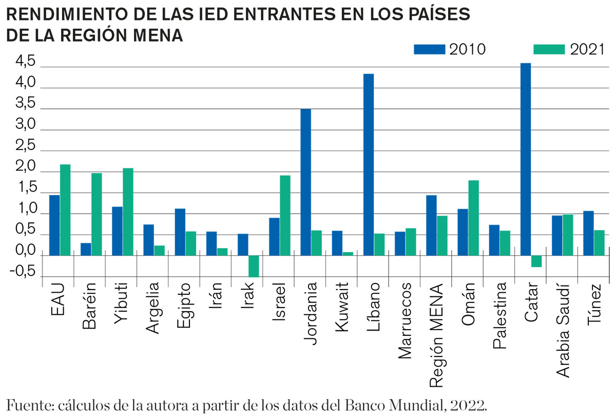Para comprender mejor la capacidad de los países de la región MENA para atraer y retener la inversión extranjera, hemos calculado el índice de rendimiento de la IED entrante (la relación entre la parte que representa un país en los flujos entrantes de la IED mundial y la que representa en el PIB mundial). En 2021, solo seis países de la región obtuvieron una puntuación superior a uno, lo que significa que estos países habían logrado atraer una mayor proporción de IED de lo que cabría esperar dado el tamaño de sus economías (gráfico 4). Ciertamente, países fiscalmente generosos como EAU y Baréin ocupan la primera posición, pero otros países poco generosos como Yibuti o países bastante generosos como Israel han logrado un buen resultado. Otros dos países, Catar e Irak, obtuvieron una puntuación negativa, lo que se traduce en unas operaciones de desinversión. Por último, el resto de los países de la región han mostrado unos resultados relativamente bajos (puntuaciones entre 0 y 1), a pesar de la riqueza de sus paquetes de incentivos a la inversión.