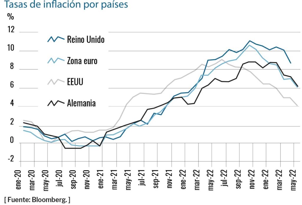 La inflación “está tardando mucho más de lo que esperábamos” en bajar. Estas palabras de Andrew Bailey, gobernador del Banco de Inglaterra (BoE), resumen la difícil situación que vive Reino Unido, rezagado respecto al resto de economías desarrolladas en el control de los precios. En abril, los niveles de inflación que soportaba el país eran del 8,7%, casi dos puntos más que el promedio de la zona euro, cuatro puntos más que Estados Unidos y más del doble que España. Ningún otro país del G7 mantiene tasas de inflación tan elevadas a estas alturas de año.