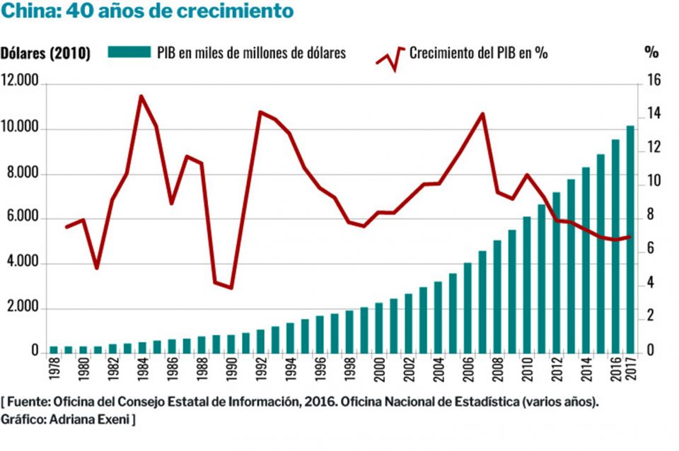 Sin modelo ni manual al que agarrarse, Pekín emprendió prácticamente solo el mayor proceso de desarrollo jamás visto. Bajo la directriz del PCCh, se concentró en la transformación del sistema económico, sin modificar un ápice su régimen político, una apuesta que Occidente consideraba abocada al fracaso. En 1978 el 80% de la población eran campesinos atados a las comunas populares, donde ni siquiera tenían libertad para decidir sus cultivos, y la economía nacional apenas representaba el 1,8% de la mundial. Por el contrario, en la actualidad supone el 18% y sigue avanzando hacia conseguir el “sueño chino”, que supone devolver el Imperio del Centro a la posición de eje del mundo que tuvo hasta el siglo XIX. Durante largos periodos de su historia, China generó el 30% del PIB mundial.